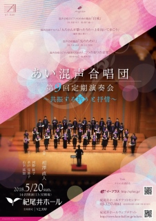 ■日時:2018年5月20日(日)14:00開演 ■会場:紀尾井ホール (東京都) 出演: 指揮:相澤 直人 ピアノ:河野 紘子・水戸 見弥子・山下 祐加(作曲家) 曲目: 混声合唱とピアノのための組曲「自戒」(詩:吉原 幸子 曲:面川 倫一) 混声合唱アルバム「九ちゃんが歌ったうた―上を向いて歩こう」(編曲:横山 潤子) 混声合唱組曲「光のために」(詩:立原 道造 曲:山下 祐加) 混声合唱とピアノ連弾のための「二つの祈りの音楽」(詩:宗 左近 曲:松本 望) チケット: 指定席(一般):¥2,500 お問合せ: あい混声合唱団 aikonchorus@gmail.com あい混声合唱団ウェブサイト