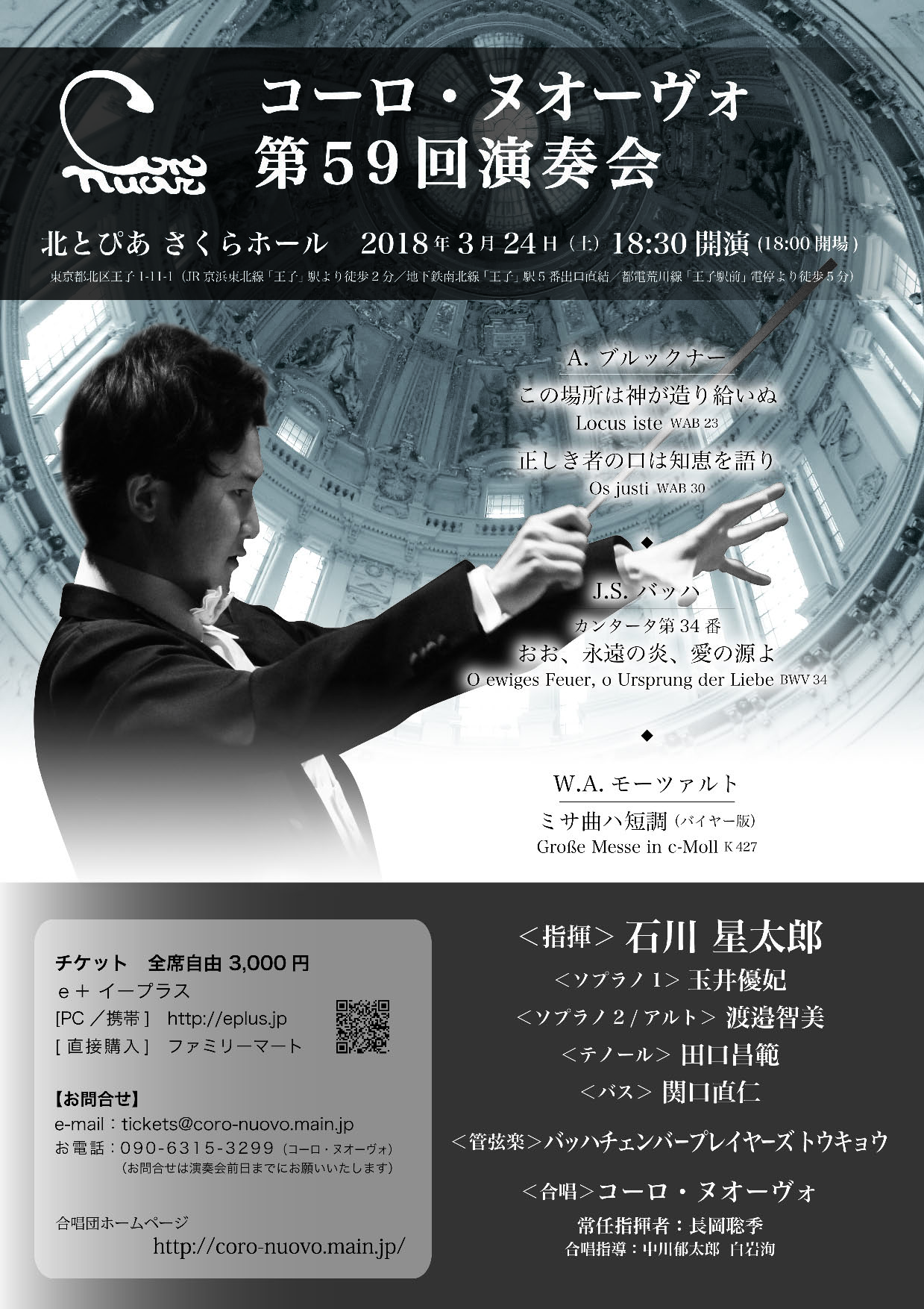 ■日時:2018年 3月 24日(土)18:30開演(18:00開場) ■会場:北とぴあ さくらホール (東京都) 出演: 指揮:石川星太郎 ソプラノ1:玉井優妃 ソプラノ2/アルト:渡邉智美 テノール:田口昌範 バス:関口直仁 管弦楽:バッハチェンバープレイヤーズトウキョウ 合唱:コーロ・ヌオーヴォ 曲目: A.ブルックナー「この場所は神がつくり給いぬ」「正しき者の口は知恵を語り」 J.S.バッハ カンタータ34番「おお、永遠の炎、愛の源よ」 W.A.モーツァルト ミサ曲ハ短調 チケット: 全席自由:¥3,000 お問合せ: コーロ・ヌオーヴォ 09063153299 コーロ・ヌオーヴォ・ウェブサイト