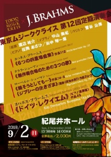 ■日時:2018年9月2日(日) 開場13:30 開演14:00 ■会場:紀尾井ホール (東京都) 出演: 【指揮】渡辺祐介 【ソプラノ】中山美紀 【バリトン】菅谷公博 【ピアノ】松岡あさひ、田中翔一朗 【合唱】東京ムジーククライス 曲目: ヨハネス・ブラームス《ドイツ・レクイエム(ピアノ連弾版)》作品45、《6つの四重唱曲集》作品112 クララ・シューマン《無伴奏合唱のための3つの歌》 ロベルト・シューマン《流浪の民》作品74-5、《裏切り》作品29-3 チケット: 全席自由:¥2,000 お問合せ: 東京ムジーククライス09049579345 東京ムジーククライス ウェブサイト
