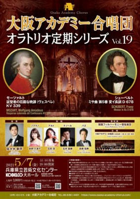 ■日時:2021年5月7日(金) 19:00分開演 ■会場:兵庫県立芸術文化センターKOBELCO大ホール 出演: 指揮:佐々木新平 合唱:大阪アカデミー合唱団 演奏:関西フィルハーモニー管弦楽団 独奏・独唱:萩野久美子(S) / 石田滉(A) / 石井基幾(T) / 高橋宏(B) 曲目: モーツァルト「証聖者の荘厳な晩課(ヴェスペレ) KV 339」 シューベルト「ミサ曲第5番変イ長調 D.678」 チケット: 3000円(座席自由) お問合せ: 大阪アカデミー合唱団:06-6361-4401