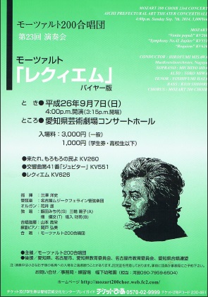 ■日時:2014年9月7日(日) 16時開演 ■会場:愛知県芸術劇場コンサートホール 出演: 指揮:三澤 洋史 管弦楽:名古屋ムジークフェライン管弦楽団 合唱:モーツァルト200合唱団 ソリスト: ソプラノ:飯田 みち代 アルト:三輪 陽子 テノール:畑 儀文 バス:塩入 功司 曲目: モーツァルト作曲 「レクイエム」(バイヤー版)KV626 「ヴェニテ・ポプリ」(来たれ、もろもろの民よ) 交響曲第41番「ジュピター」 チケット: 全席自由 3,000円(一般) 1,000円(高校生以下) お問合せ: 河田:090-7959-6504 モーツァルト200合唱団HPはこちら