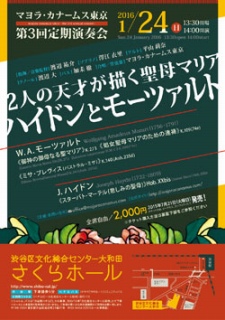 ■日時:2016年1月24日(日) 13:30開場 14:00開演 ■会場:渋谷区文化総合センター大和田・ さくらホール 曲目: W.アマデウス・モーツァルト: 御神の御母なる聖マリア K.273 処女聖母マリアのための連祷 BMV K.109(74e) ミサ・ブレヴィス(パストラル・ミサ)K.140(Anh.235d) ヨーゼフ・ハイドン: スターバト・マーテル(悲しみの聖母)Hob.XXbis 出演: 渡辺祐介(指揮/音楽監督) 澤江衣里(ソプラノ) 平山莉奈(アルト) 渡辺大(テノール) 加耒徹(バス) マヨラ・カナームス東京(合唱/管弦楽) チケット: 全席自由 2,000円 お問合せ: マヨラ・カナームス東京:050-5889-4945 マヨラ・カナームス東京のHP