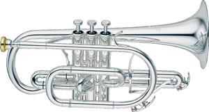 形態はトランペットに似ているが、管の形状が円錐管であることが大きく異なります。(トランペットは円筒管部分の割合が多く、開口部近くになって急にラッパ状に広がる)。そのため、音に鋭さや華やかさは少ないが、まろやかで柔かな音になっている。オーケストラ作品ではフランスとロシアの作曲家に多く用いられています。主に吹奏楽や英国式ブラスバンド、ジャズなどで使われることが多い。